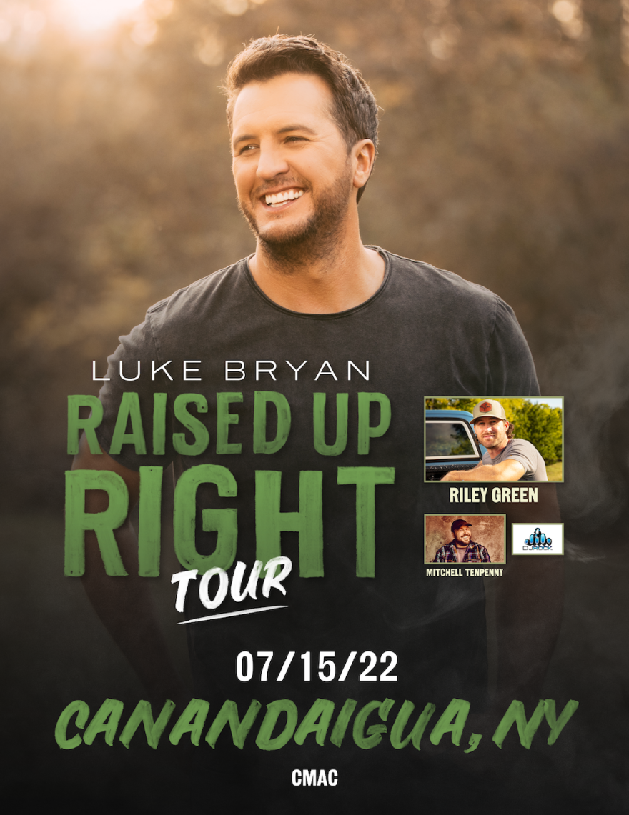 Country superstar Luke Bryan brings his “Raised Up Right” tour to the Finger Lakes, promoting his 2020 album, “Born Here Live Here Die Here.” His latest single is “Country On.” Riley Green and Mitchell Tenpenny open the show.