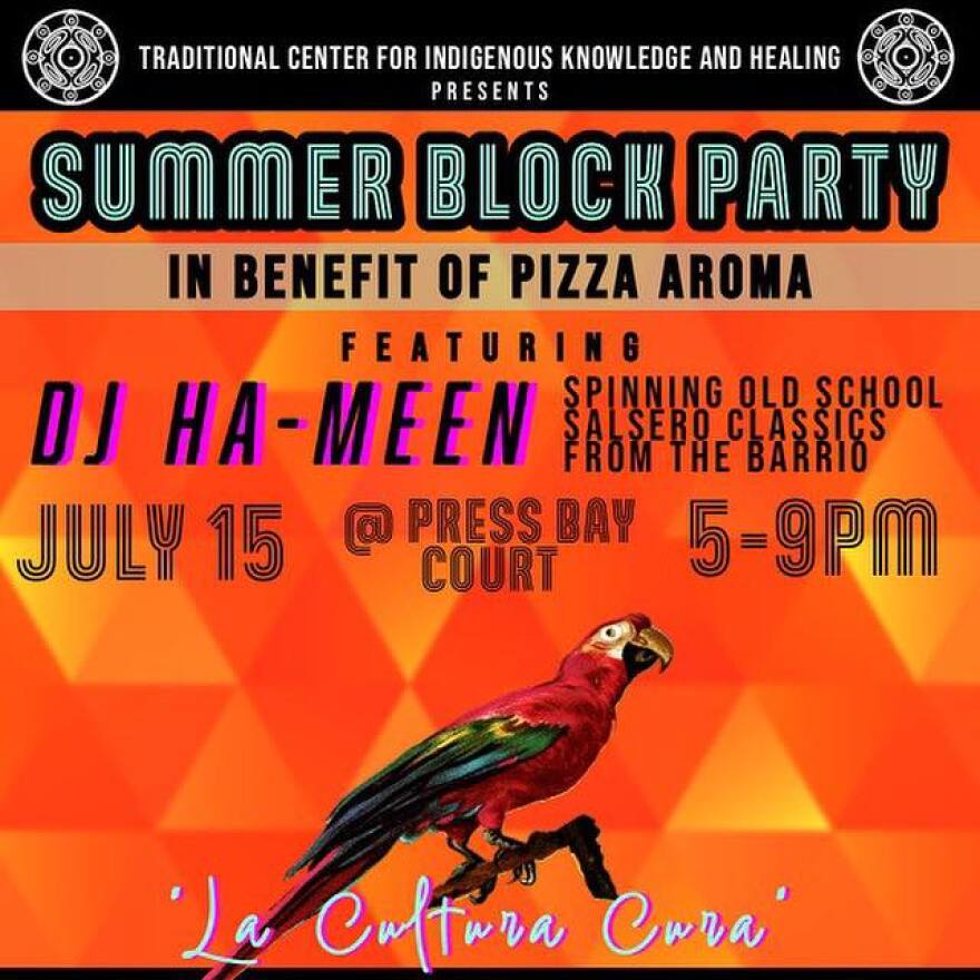 The Traditional Center for Indigenous Knowledge and Healing and Press Bay will present a Summer Block Party – “A fundraising event promoting the health and wellness of our Latino community through providing a space for community based on culture!” – to benefit nearby restaurant Pizza Aroma. DJ ha-MEEN will spin “old-school salsero classics from the barrio,” and there will also be vendors and a silent auction.
