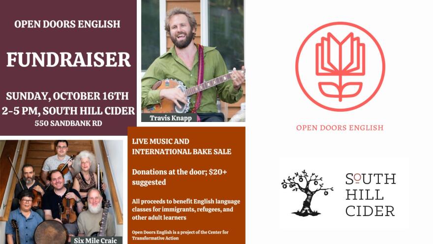 South Hill Cider will host an event to benefit Open Doors English's English as a Second Language program, “particularly to serve low-income students including new refugees from Afghanistan and Ukraine.” Local favorites Travis Knapp and Six Mile Craic will provide live music during the event, which also will feature Open Doors English’s "Taste the World" international bake sale. Find out more about the organization here!
