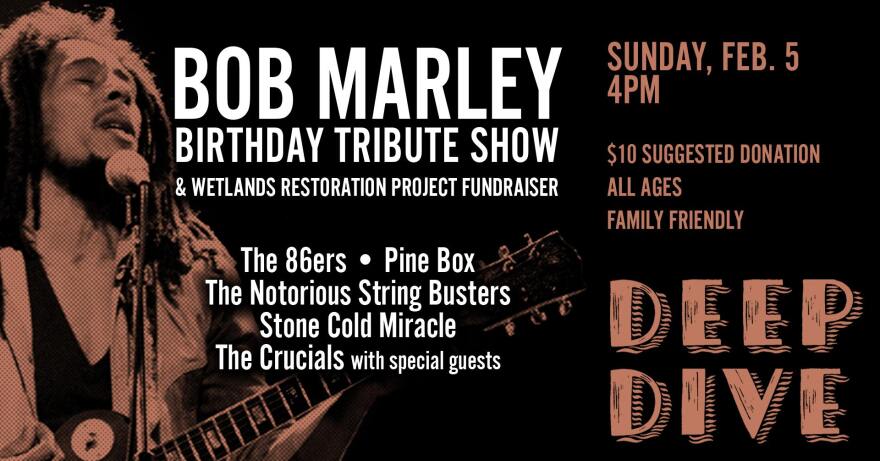 Deep Dive will host the “Bob Marley Birthday Tribute Show” to benefit the Cayuga Wetlands Restoration Project. The all-ages, family-friendly event will feature Jamaican-themed food and drinks, a silent auction, and performances of classic Bob Marley songs by The 86ers, Pine Box, The Notorious Stringbusters, Stone Cold Miracle, and The Crucials with special guests. “Lots of singers and players of instruments have been influenced by the works of Bob Marley. What a great opportunity to get people together from many genres of music to pay tribute. Join us as we take a journey with some of our favorite artists from the area performing their versions of Bob songs.”