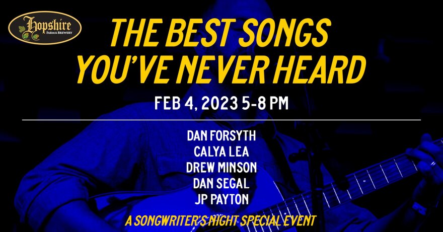 “For over a year Hopshire has been hosting a monthly Songwriter Night. Dan Forsyth has curated a list of 5 ‘best of the best’ songwriters to perform for you at a special musical event. So come and enjoy a night of ‘The Best Songs You've Never Heard’ ...and a shout out to Dan Forsyth of Driftwood for making this event possible. Truly a showcase of the great local talent we have.”