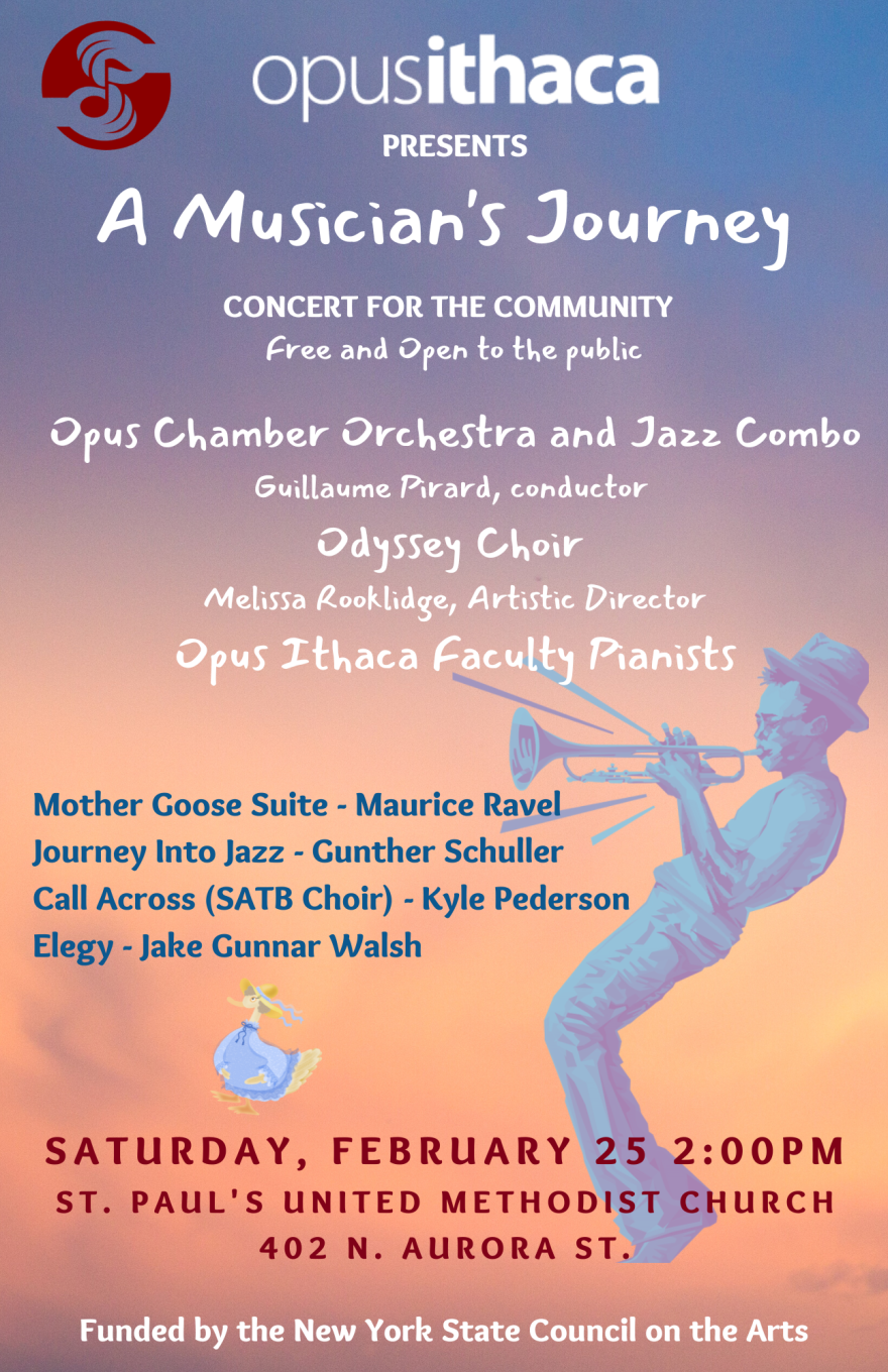 Opus Ithaca School of Music will present “Concert for the Community: A Musician's Journey,” featuring the Opus Ithaca Chamber Orchestra and Jazz Combo; Guillaume Pirard, conductor; Odyssey Choir; Melissa Rooklidge, artistic director. The program will include “Mother Goose Suite” (Maurice Ravel), “Journey Into Jazz” (Gunther Schuller), Call Across (SATB Choir) (Kyle Pederson), and “Elegy (Jake Gunnar Walsh).