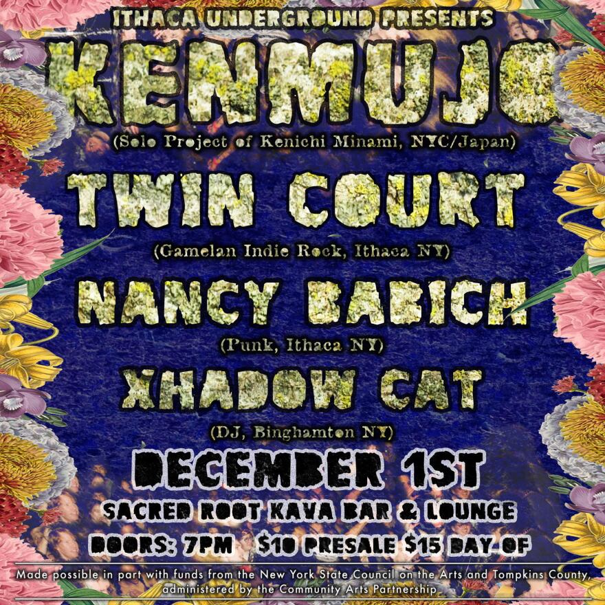 Ithaca Underground presents a show at Sacred Root, headlined by Philadelphia-based KENMUJO, “Japanese singer, songwriter and guitarist Ken Minami’s explosive solo performance outfit, a wild jet engine of tube amplified, howling feedback-laden acoustic guitar driven songwriting & noise performance.” Also on the bill is Ithaca post-rockers Nancy Babich, Binghamton-based techno DJ Xhadow Cat, and Ithaca’s Twin Court, bringing gamelan-indie-rock fusion to the show.
