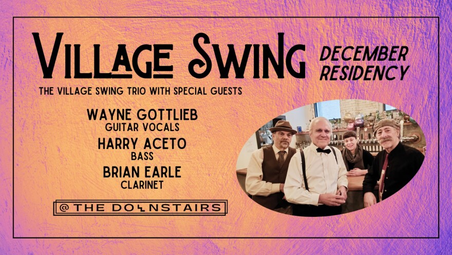 Village Swing is back for a December residency at the Downstairs, with the Village Swing Trio – Wayne Gottlieb (guitar, vocals), Harry Aceto (bass), and Brian Earle (clarinet) – joined by special guests throughout the month. This Saturday, Joanna Green (violin, vocals) will join the trio, followed by Paul Merrill and Chad Lieberman on Dec. 9 for the Chet Baker Birthday Bash, Catherine Gale on Dec. 16, and Alice Saltonstall (vocals) and Ted Caldwell (bass) for a Holiday Party on Dec. 23.