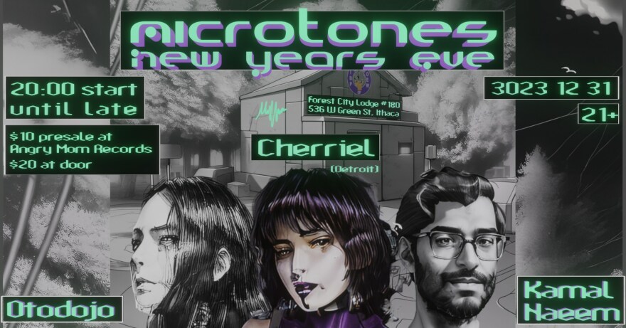 Microtones returns to Forest City Lodge 180 on West Green Street for its latest event. “We’re pleased to announce that we’ll be ringing in the new year with special guest Cherriel, from Detroit, alongside residents Kamal Naeem and Otodojo.”